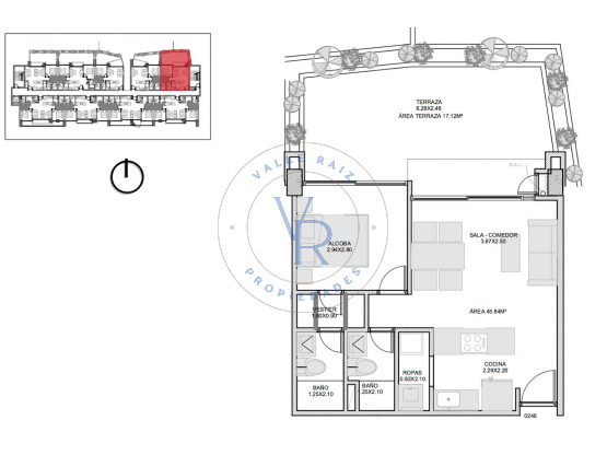 - Área: 46 m² + Terraza 17 m² (mirando hacia quebrada)